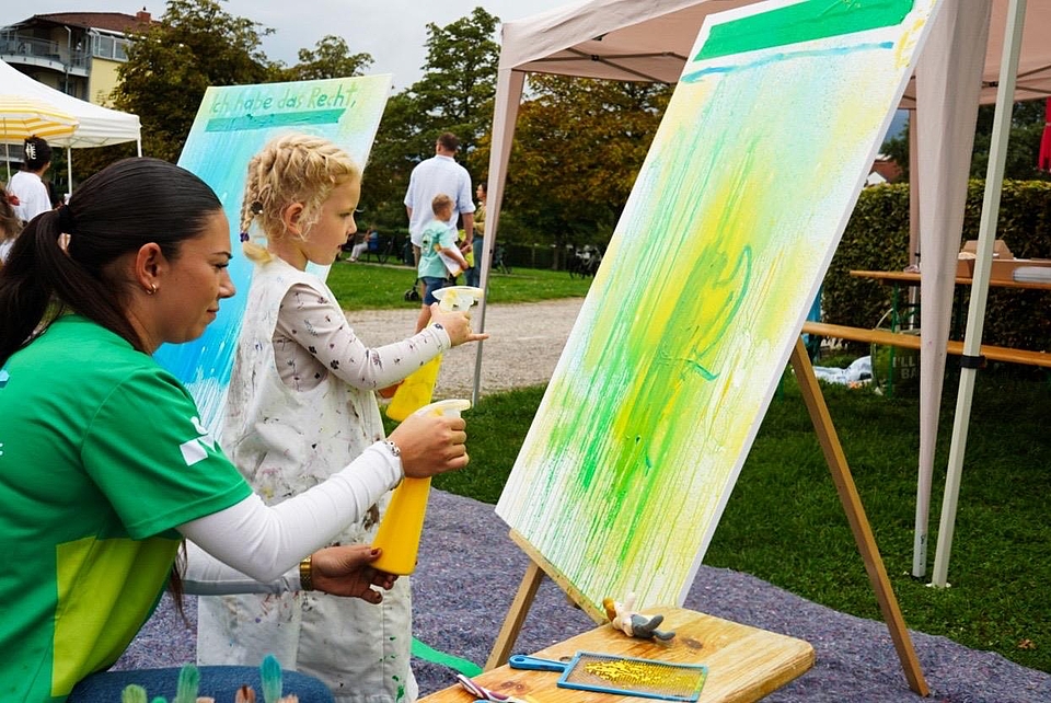 Trotz Regens gestalteten Kinder in Freiburg kreative Plakate zu ihren Rechten – mit Actionpainting und viel Freude.